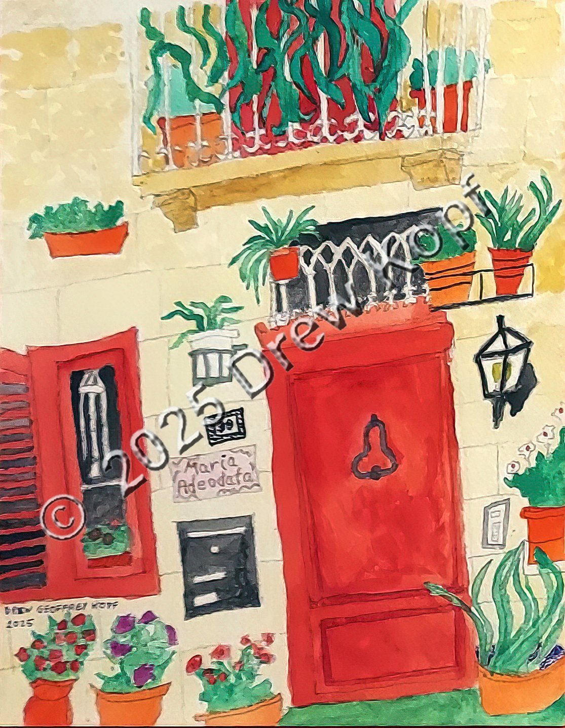 Red Door in Malta Watercolor - 11" x 9" (nominal) by Drew Kopf. Signed and dated "Drew Geoffrey Kopf 2025 " lower left hand corner. Original in the posession of the artist. Front Door belonging to the dwelling of Maria Adeodata Pisani, a native of Malta who was a very special woman of the 1800s indeed. See the srory of her life on Wikipedia. Price: Original: $2,500.00 including frame of choice; exclusive of shipping related charges. Giclee copy. Please request a quote by including size of giclee copy desired and destination city, state and Zip Code.
